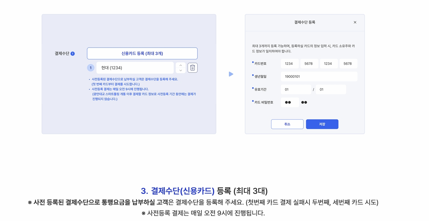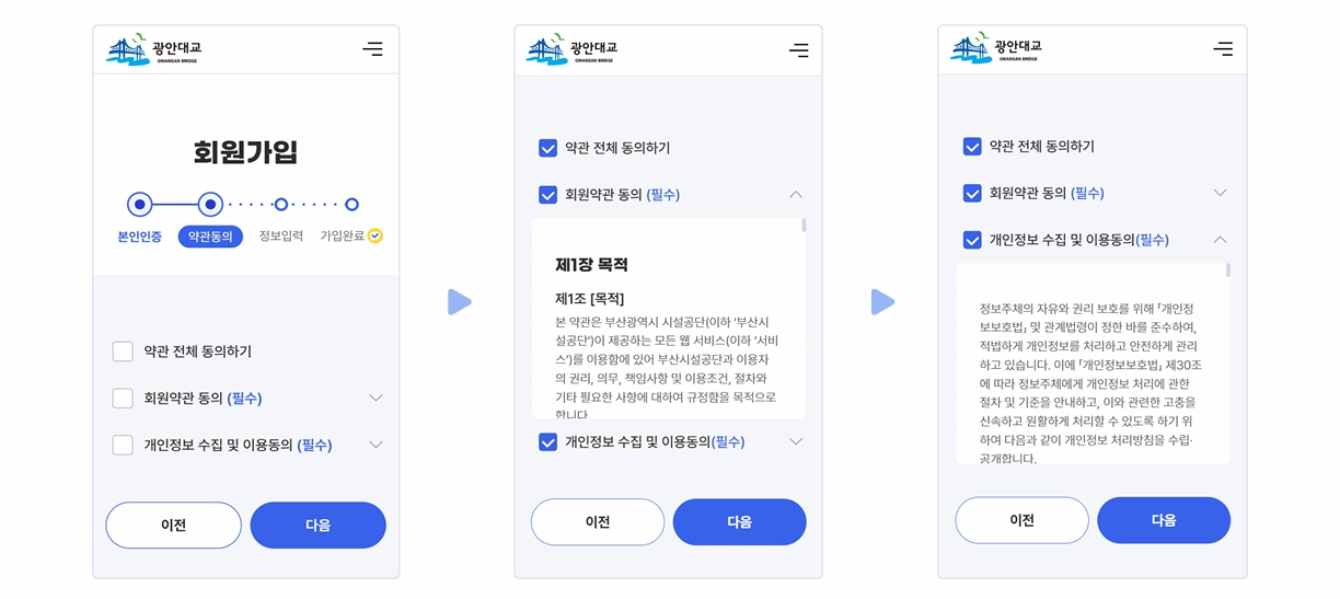Home 카테고리 없음 광안대교 스마트톨링 사전등록 방법 광안대교 스마트톨링 사전등록 방법 박흥비 2025. 1. 22. 사전등록 절차도 사전 등록하기 전에 본인이 등록이 필요한 대상인지 먼저 확인해 보기시 바랍니다. 사전등록하러 가기 사전등록 가입 방법 휴대폰 인증 약관동의 회원약관 동의, 개인정보 수집 및 이용동의 필수 정보입력 가입완료 선불 / 후불 전자카드번호 확인방법 반응형 공유하기 게시글 관리 부자되세요! 댓글