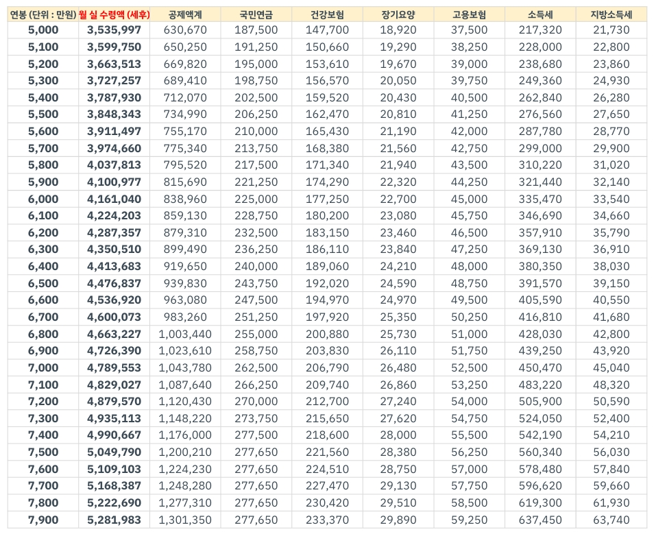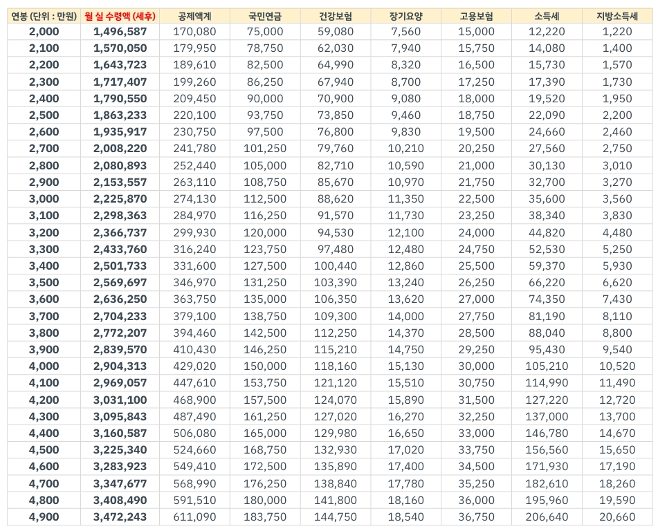 연봉별 실수령액